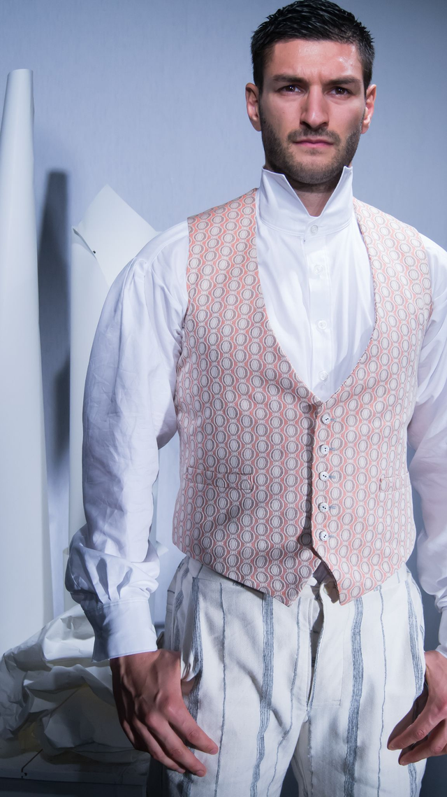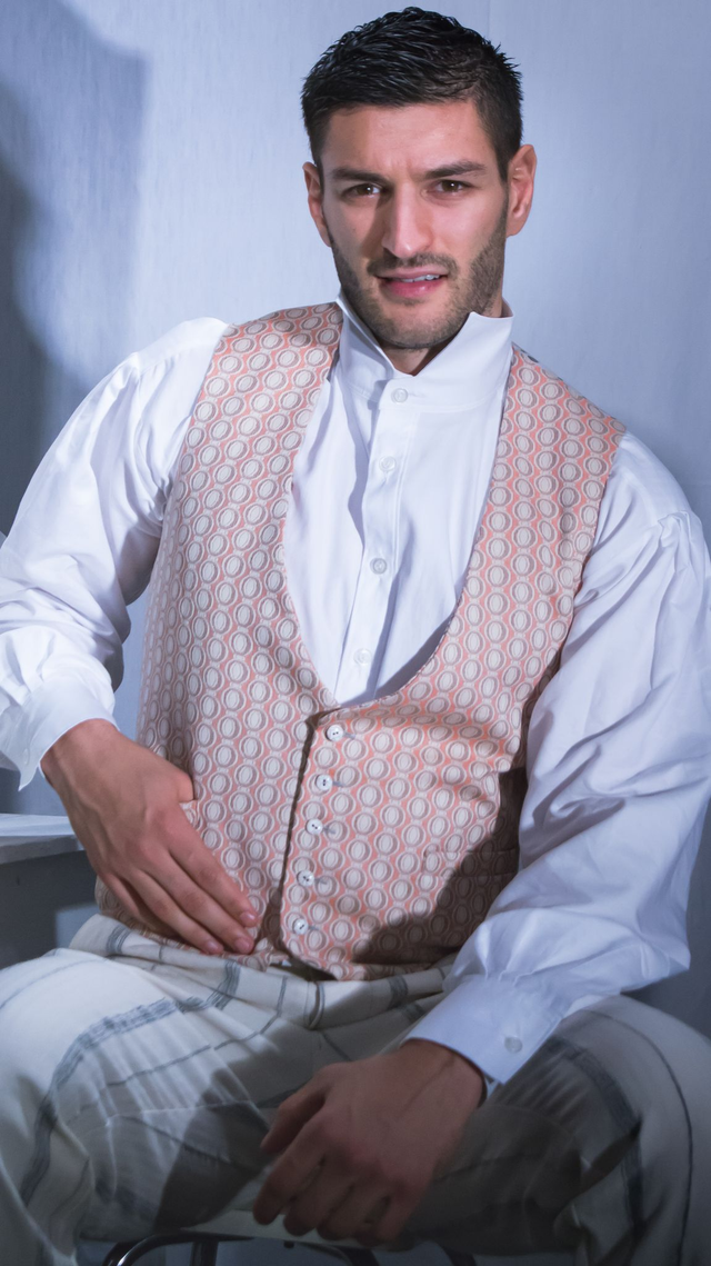 Le gilet se ferme avec cinq boutons sur le devant et s'ajuste à l'aide de pattes en tissu dans le dos