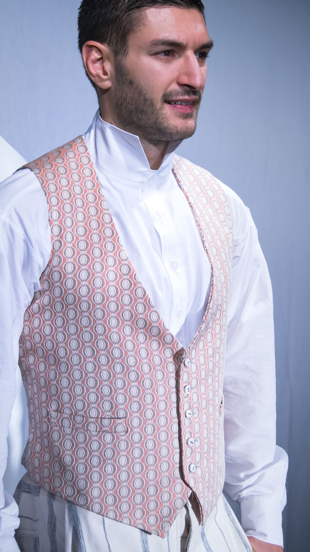 Le Gilet "BULLES ROUGES" réalisé en tissu métisse d'une belle qualité agréable à porter, un melange de coton et synthétique