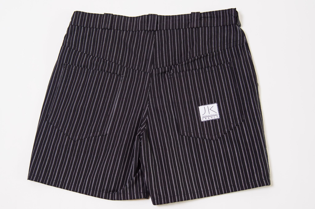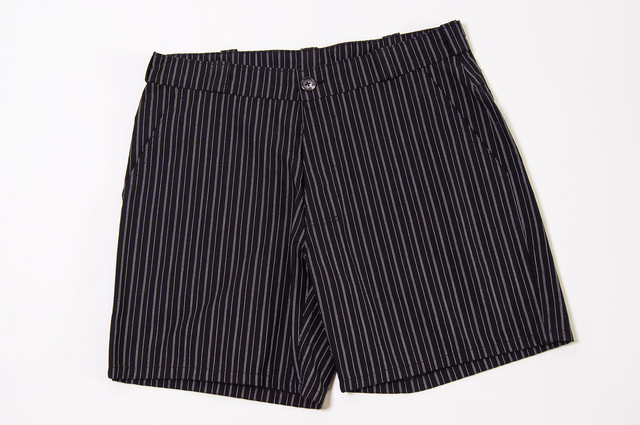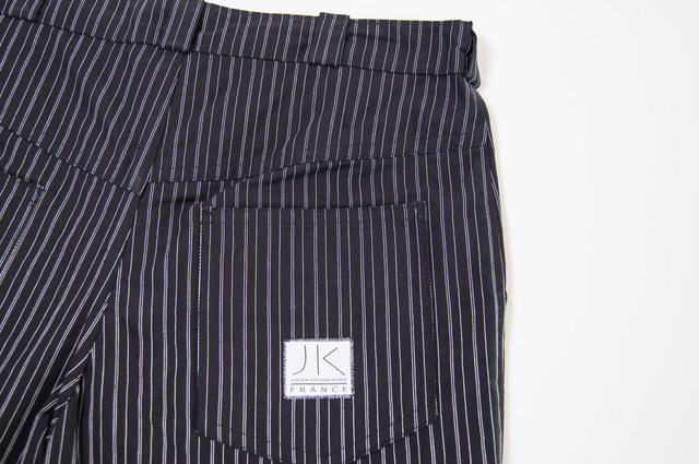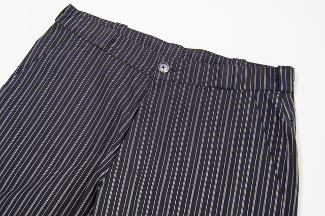 Coupe classique, 100% coton robuste. Tissu noir avec fines rayures blanches. Poches, braguette à bouton, ceinture avec passants