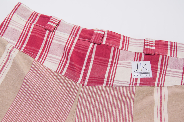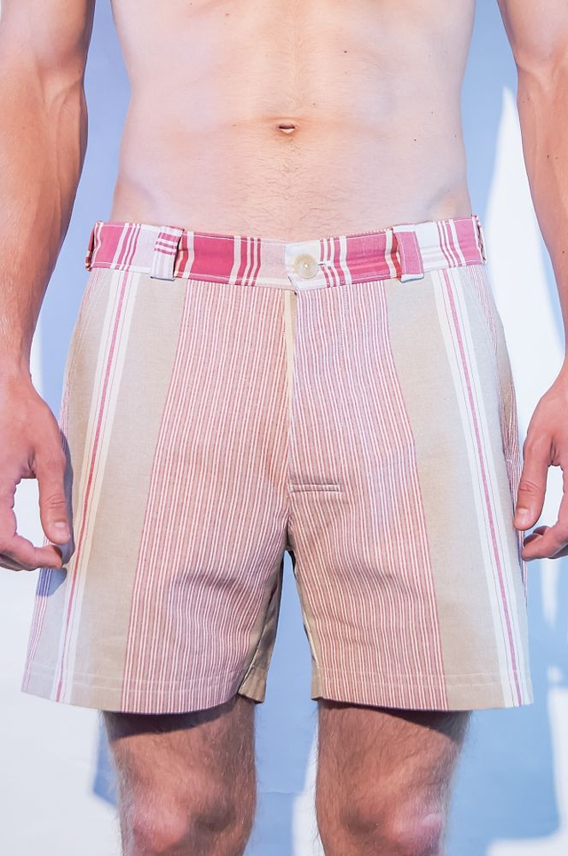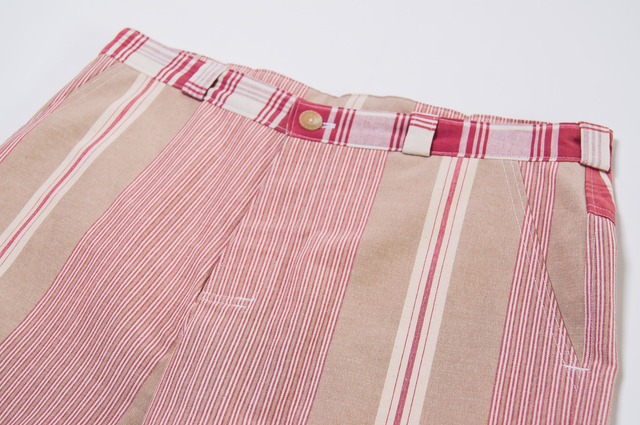 Coupe classique. Tissus mélange coton et synthétique. Rayures rouges, blanches et beiges. Poches, braguette à bouton, ceinture avec passants