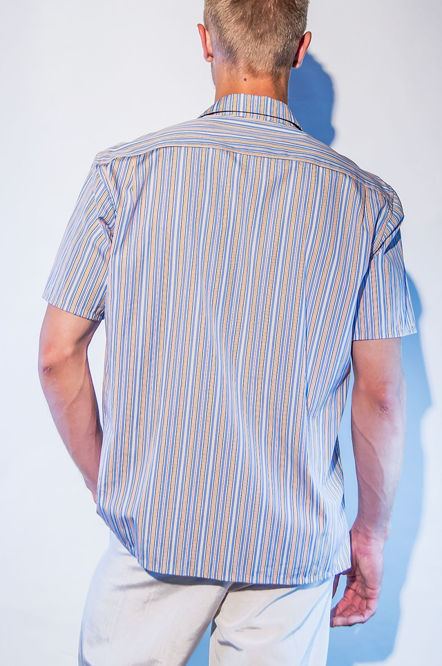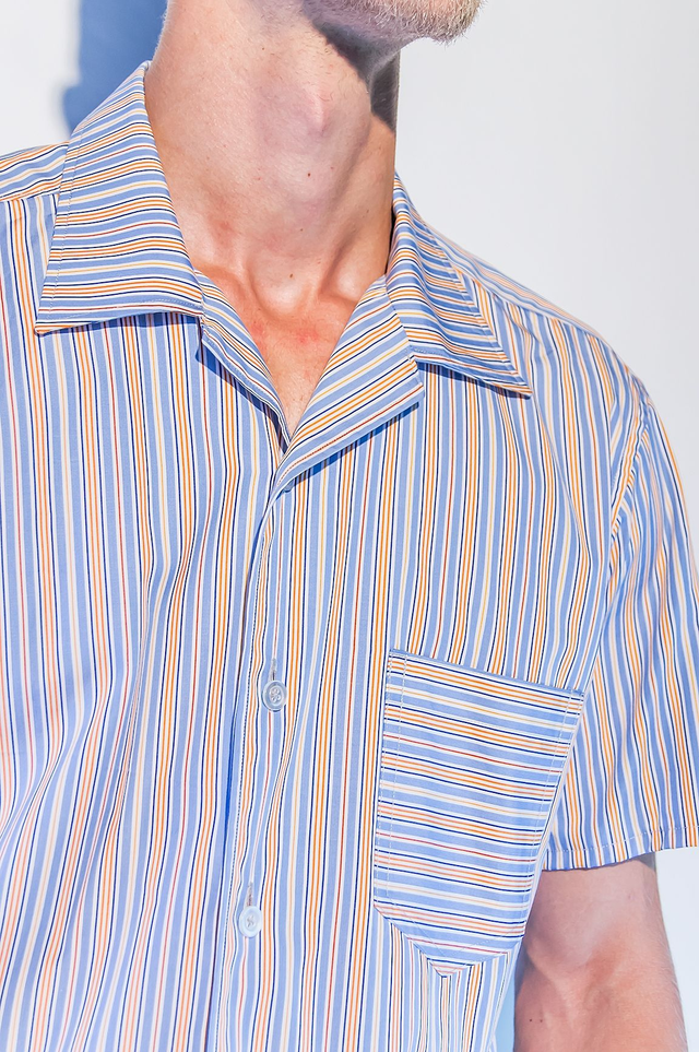 Chemisette légèrement cintrée, 100 coton, rauyres bleues, blanches et oranges. poche sur le devant, col plat, 5 boutons