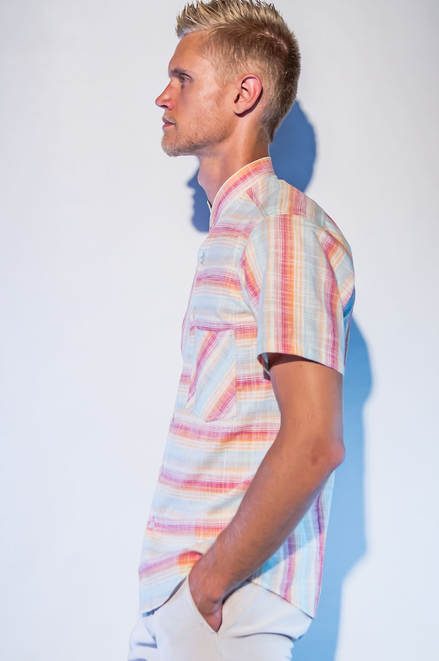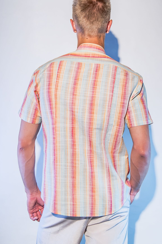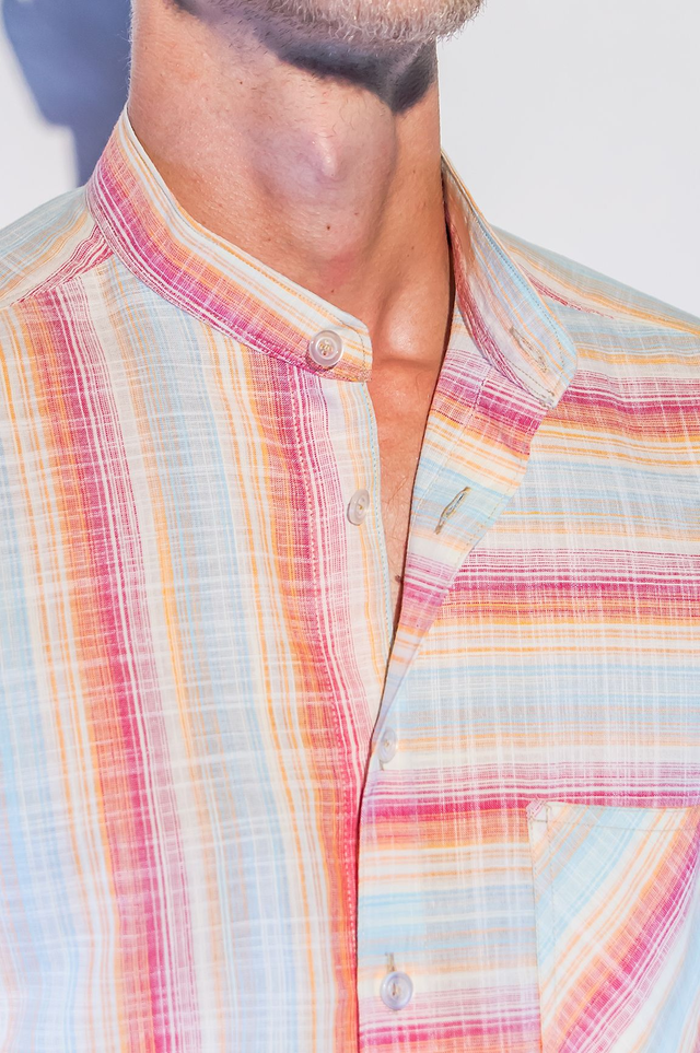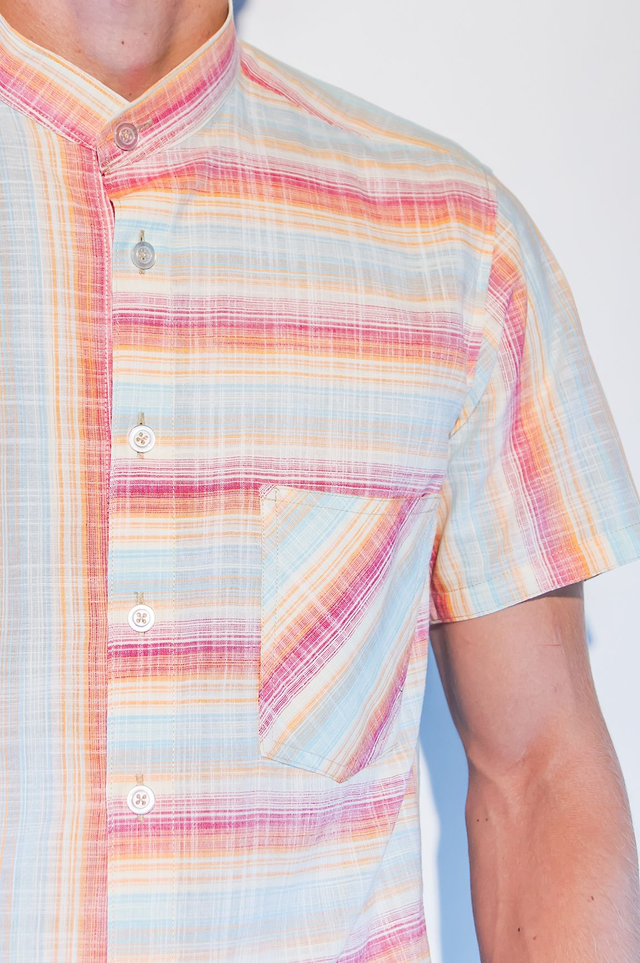Chemisette en coupe cintrée sur les cotés et dans le dos, 100% coton, rayures multicolores, poche sur le devant, 7 boutons, col "Mao".